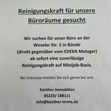 32257 Bünde Minijob mit Anmeldung 15 €Wohnung allgemein Putzen im Mehrfamilien Haus Ich suche eine zuverlässige Person für die gelegentliche Reinigung meiner 2-Zimmer-Wohnung (ca. 40 m²) in Bünde. Die Aufgaben umfassen allgemeine Wohnungsreinigung. Die Tätigkeit wird als Minijob mit Anme…